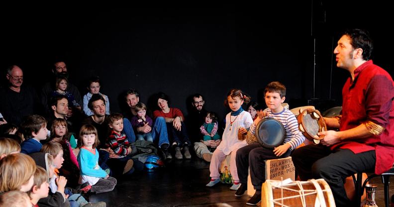 Murat Coskun präsentiert seinen kleinen und großen Zuhörer:innen die faszinierende Trommelwelt der verschiedenen Länder des Orients.