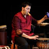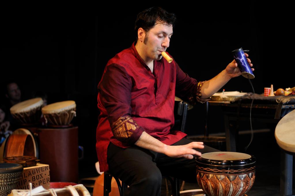 Er schöpft aus dem traditionellen Rhythmus-Repertoire, singt Lieder aus der Türkei und erklärt die Beschaffenheit seiner vielseitigen Instrumente.